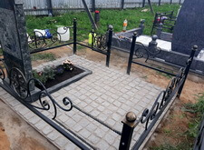 Брусчатку замываем водой: пескобетон размокает, превращаясь в надёжный скрепляющий раствор. На этом наши работы на могиле закончены, клиент выразил благодарность за оперативность и качество оказанных услуг.